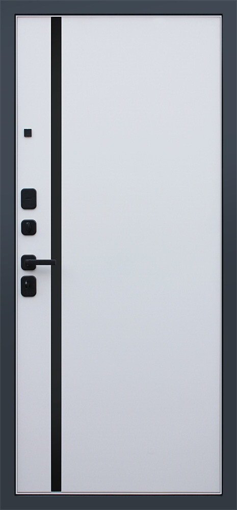 Порошковое покрытие "муар черный". Экошпонированная панель МДФ 10 мм (дизайн ФЛС). Цвет "черный кварц". Вертикальная вставка из черного глянцевого лакобеля. Объемная фрезеровка. Наличник МДФ гладкий, 80 мм.